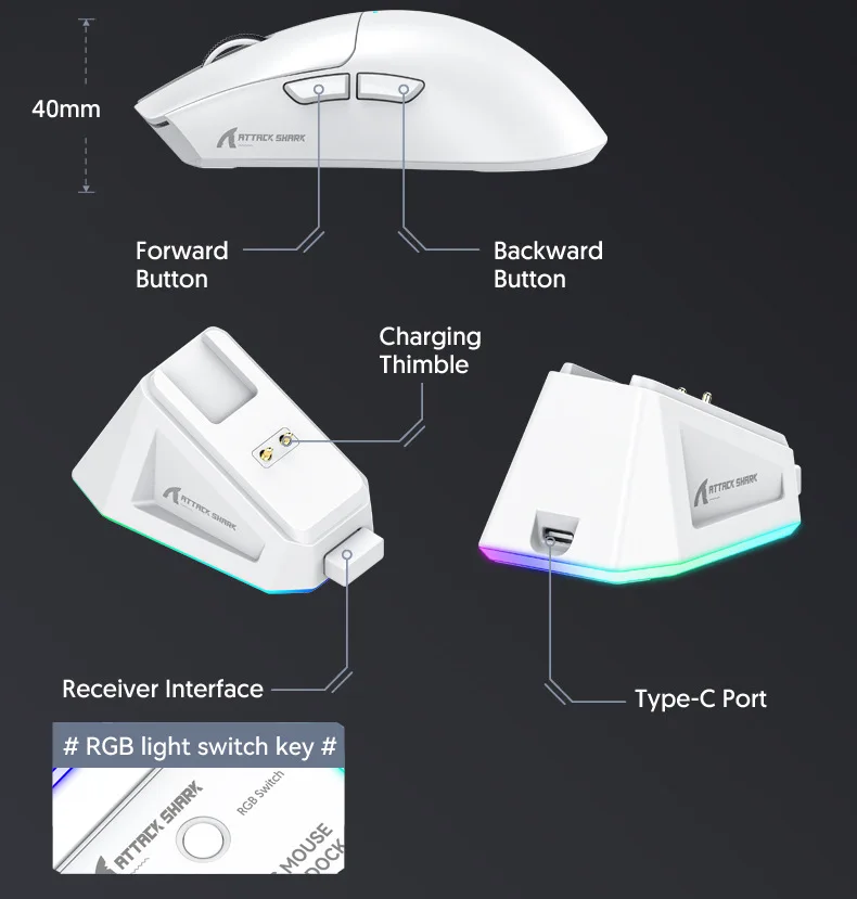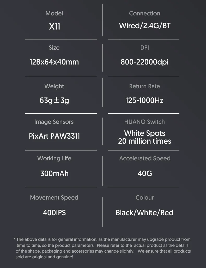Product Paramenters Model: x11 Connection: Wired/2.4G/Bluetooth Dimensions: 128x64x40mm DPI: 400-22000 ppp Weight: 63g±3g Battery Life: 65 hours Polling Rate: 125-1000Hz Image Sensor: PixArt PAW3311 HUANO Switch: White dot 20 million