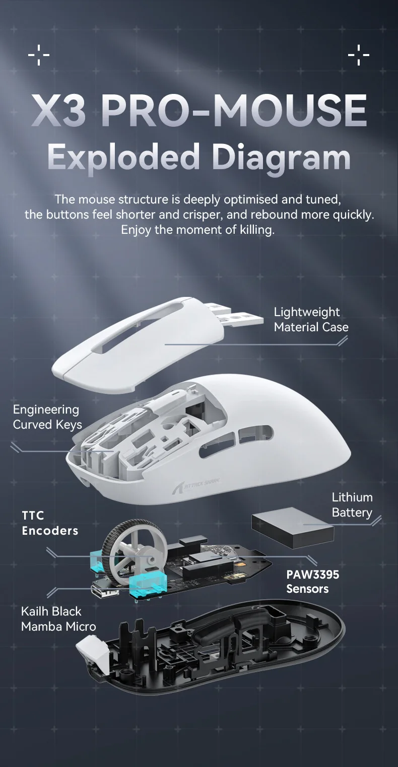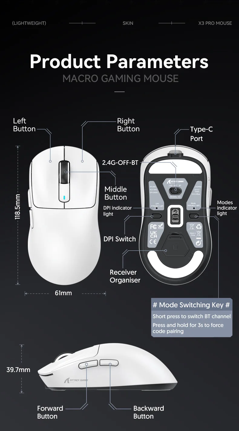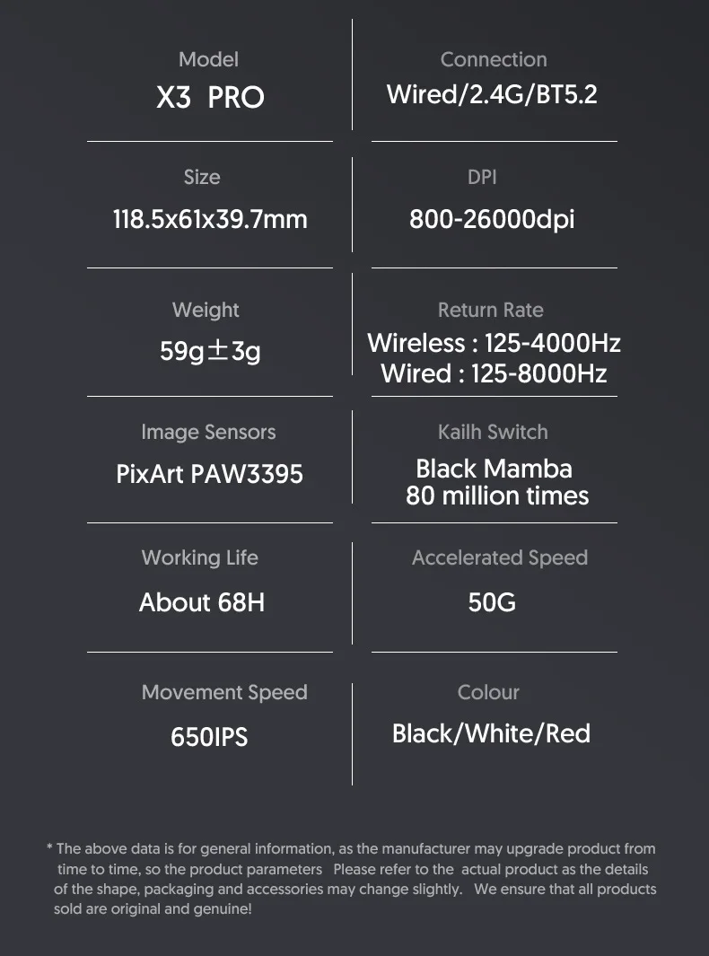 Product Features: Attack Shark X3PRO Mouse Tri-Mode Wireless PAW3395 4K Sensor Lightweight Gaming Mouse Specifications: Model Attack Shark X3Pro Box size