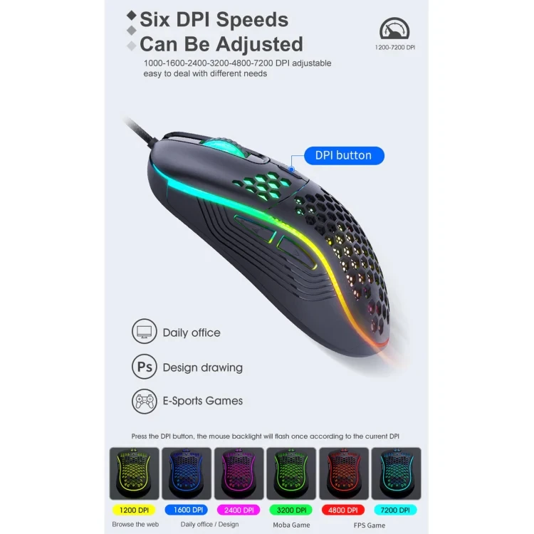 Product Features: IMICE T98 7200 DPI USB Wired Lightweight Honeycomb Gaming Mouse for PC Specifications: Model IMICE T98 7200 DPI USB Wired Lightweight Honeycomb Gaming Mouse for PC Box size