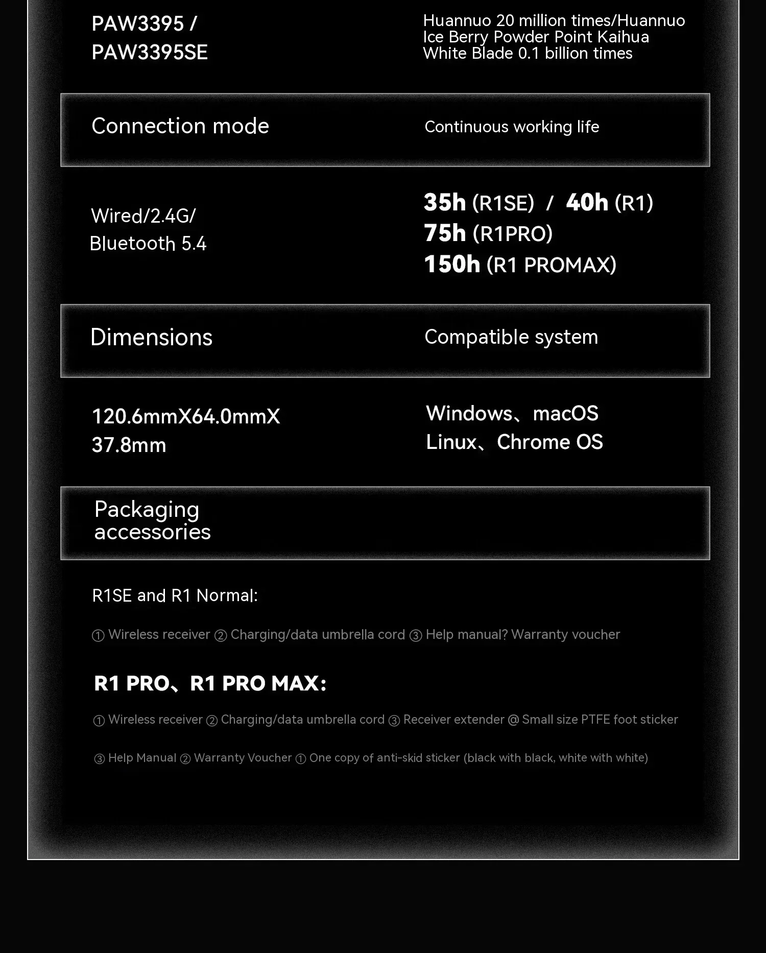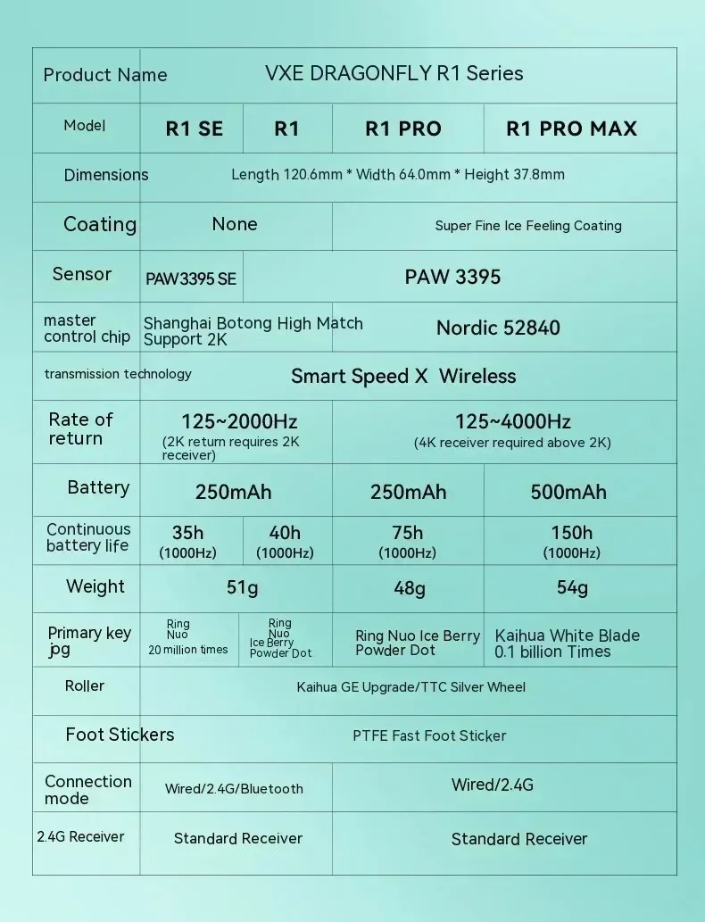 Product Features: VXE Dragonfly R1 Gaming Mouse Wireless Mouse Nordic 52840 PAW3395 2KHz 2.4G Office Gamer Pc Gaming Specifications: Item Type 2.4G Wireless Mouse Model Number VXE Dragonfly R1 Series